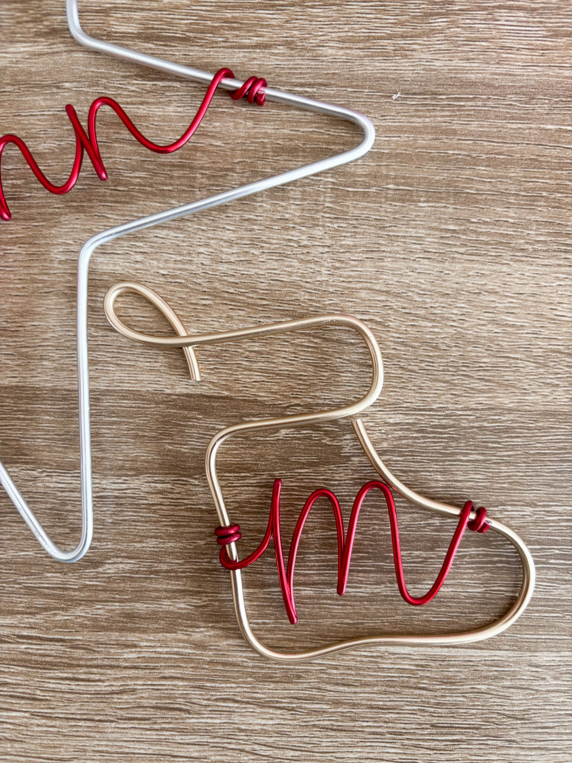 Add a unique touch to your festive celebrations with our handmade wire Christmas bauble, also perfect as a personalised place name for your holiday table. Crafted from durable aluminium wire in your choice of colours, each piece is shaped into a charming Christmas stocking design with your chosen initial beautifully worked into the centre.